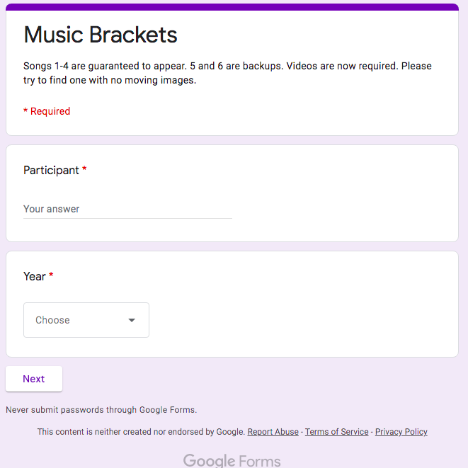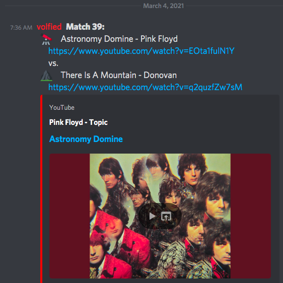 A group of music fans among us have taken on the sizeable task of determining the best songs of each year from 1963 to the present, as well as the years going back to 1925 in five-year blocks. I manage the technical infrastructure of the project. Using Google Forms, participants submit up to 6 songs for each randomly selected year. The songs are seeded according to the order each participant submits them. They are then divided up into a bracket of one-on-one matches. These matches are decided by votes conducted in a dedicated Discord channel. We track a few analytics, such as performance by genre (pulled in using Spotify’s API), genre preference by participant, etc.